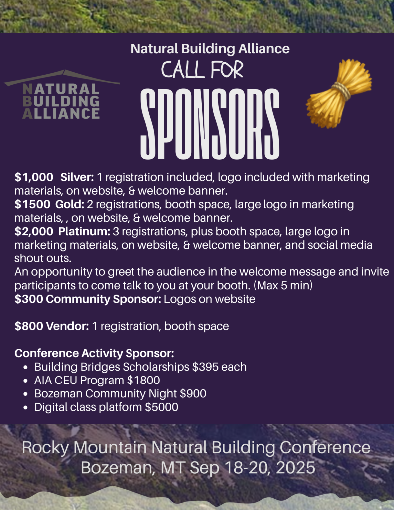 Post author:nballiance Post published:April 21, 2025 Post category:Natural Building For More Sponsor Information CONTACT NATURAL BUILDING ALLIANCE Email: naturalbuildingalliance@gmail.com Phone: (720) 310-0341 You Might Also Like Bozeman Breakthroughs: Resilience Mindsets Inspired by RMNBC January 12, 2026 Code Updates For Natural Building Appendices in the IRC November 12, 2025 2025 Building Bridges Scholarship April 21, 2025